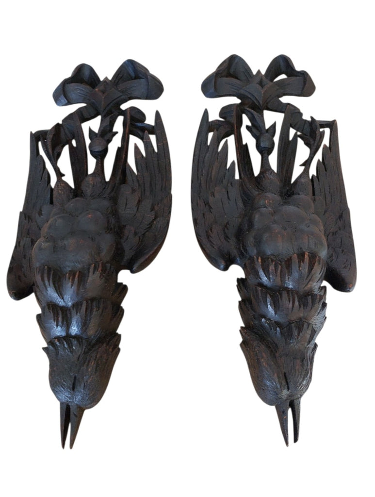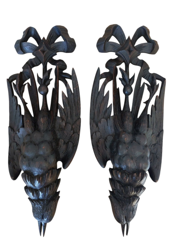 ( set ) Antique Black Forest Wall Ornaments – Hand-Carved Walnut, 19th Century
